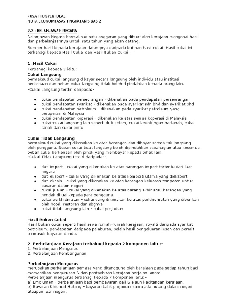 Ekonomi Kerajaan 11 Peranan Kerajaan dalam Ekonomi 12 Penunjuk Ekonomi 13 Alat Dasar Ekonomi Bab 2. -tidak boleh masyarakat 3. PUSAT TUISYEN IDEAL NOTA EKONOMI ASAS TINGKATAN 5 BAB 2.